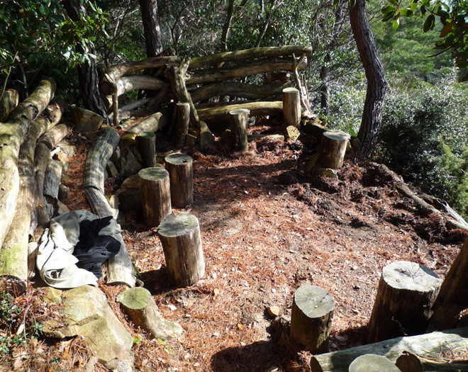 七兵衛山の頂上付近のお休み処だ。この材料は6~700メートルも離れて下方から運んだ。