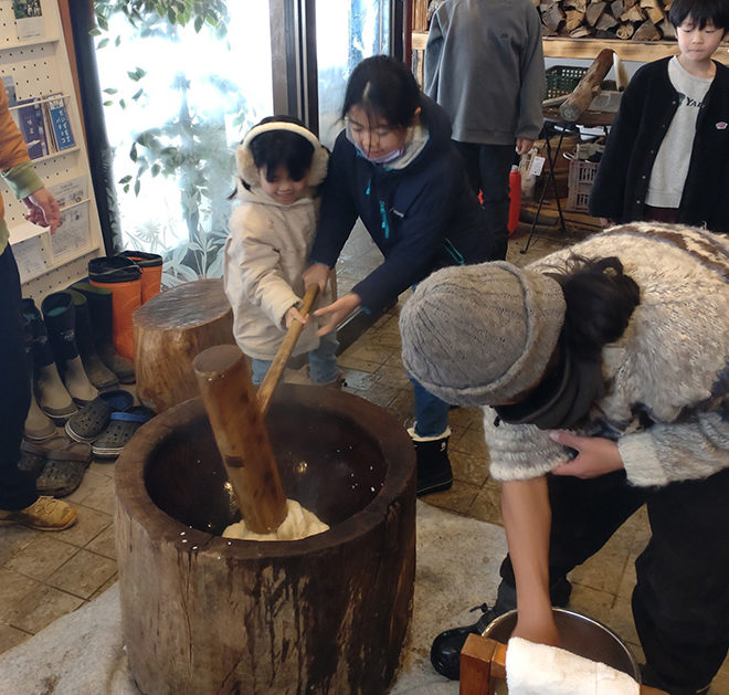 突きたて餅は、あんこ、きな粉、ポテトチップ、大根おろしをまぶして餅フルラインナップ。