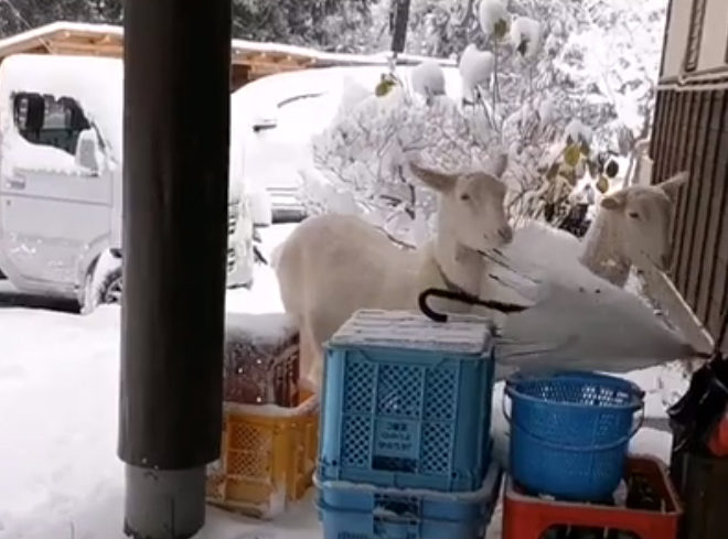 2020.12.16 本格的な雪になっています。 ヤギたちは寒さに強く、雪なんかなんのその、駆け回っています❢ 黒いのはイノシシではありません。