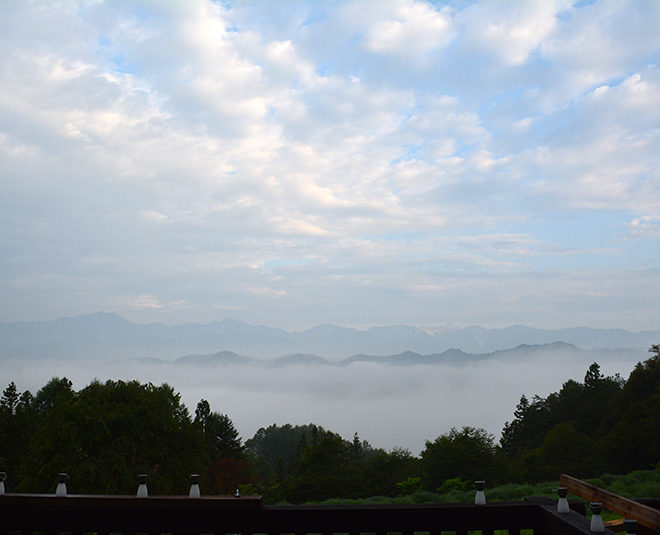 今朝の北アルプスは夕べの雨のせいか水蒸気が立ち上がっていますが顔をだしました。