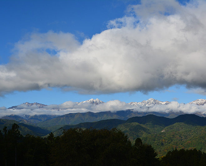 2021.10.18 18日am7:00で気温3度となりました。 雲の切れ目から北アルプスが顔を出すと白馬岳方面から爺が岳付近まで白くなっていました。 今シーズン初冠雪です。