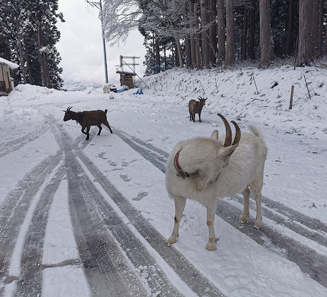 北アルプス絶景ヤギと雪道散歩