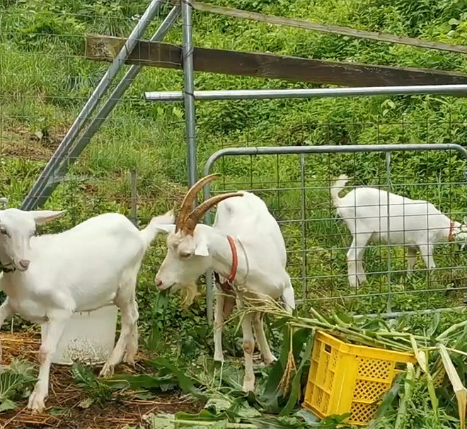 子ヤギたちは草を懸命にたべていますが、私がエリカを抑えるとまだお乳に飛びついてきます。