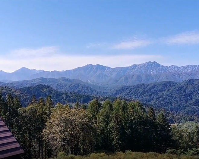 2020.10.19 一階ロビーから2階客室への動画です。 晴れると客室からは北アルプス絶景です。 1階2部屋、2階3部屋すべて北アルプス向き。 手前の山に紅葉前線がおりてきました。