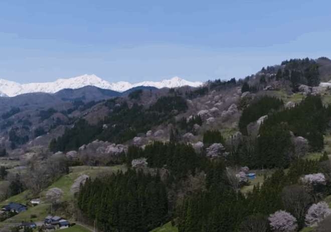 2025.4.17 信州小川村は桜の季節です。 小川村には8000本の桜があると言われています。 裏立屋地区から見た細越集落です。里山に点在する山桜がきれいです。