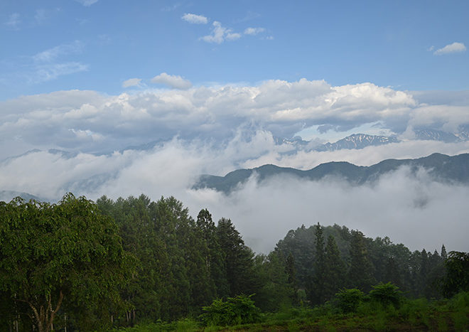 2023.7.12 夜半に小雨となったようで地面が濡れています。 その雨が水蒸気となって湧き上がっています。 こんな景色をみながらの朝食できます!! 北アルプスみは日本海側から雲が押し寄せているようです。