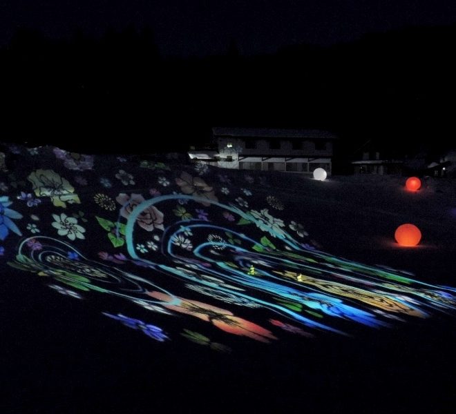 雪に描く光の切り絵in大洞高原が開催されました。光の切り絵作家酒井敦美さんによる野外幻灯。