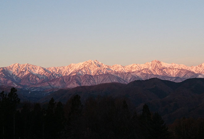 北アルプスは白くなってモルゲンロートもあざやかになってきます。