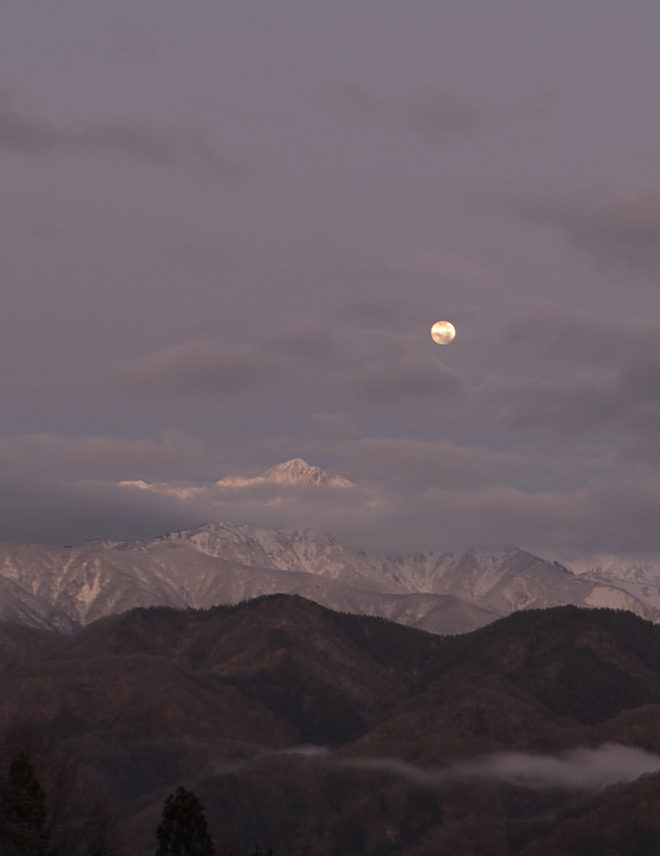 満月が西の空に煌々と輝いて西(北アルプス)を向いている林りん館は明るい朝でした。