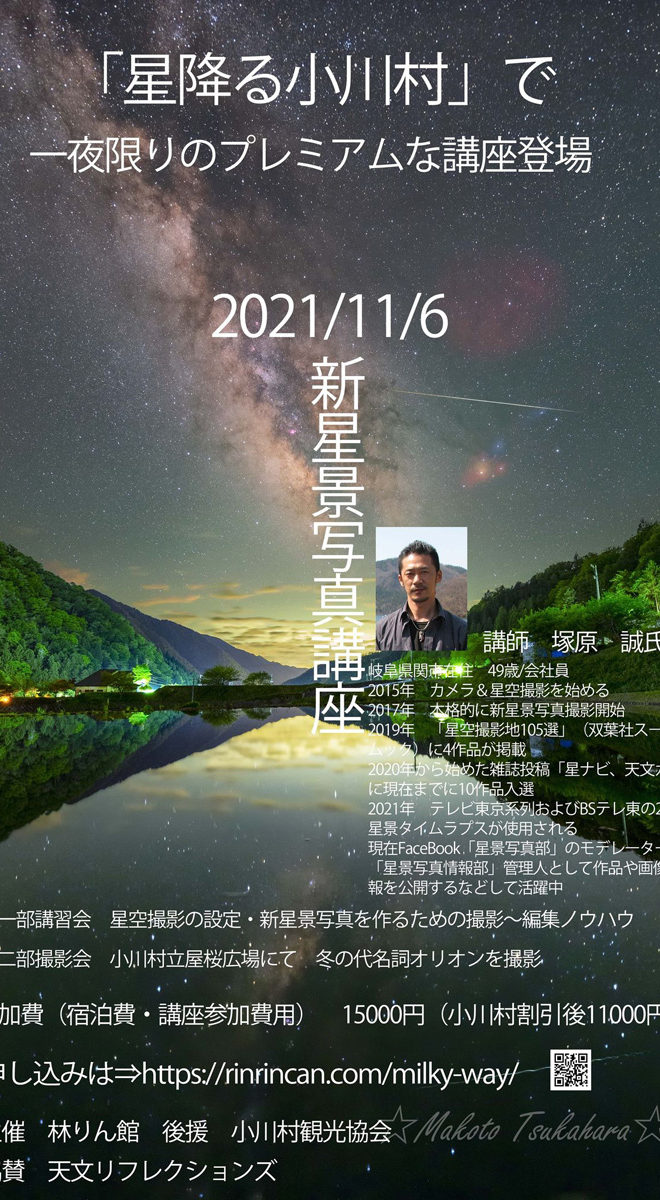 北アルプス絶景の宿「林りん館」初開催の夜空撮影講座イベントをやります。 講師は、塚原誠さん。 多くの方からの申込者ありがとうございました。 キャンセル待ちも含めて締め切らせていただきます。