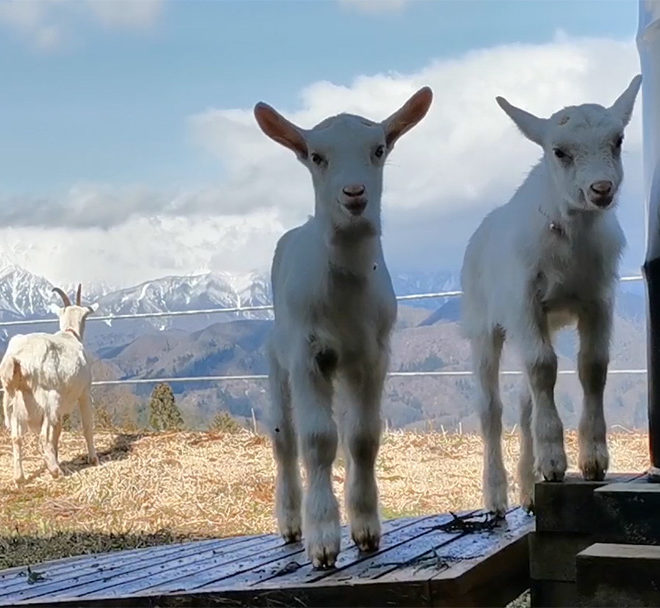 4月14日は早朝から風の強い一日でした。 霜が降りて子ヤギたちは遊び場で滑っていました。 午前中にかかっていた雲は午後には取れて北アルプス絶景でした。