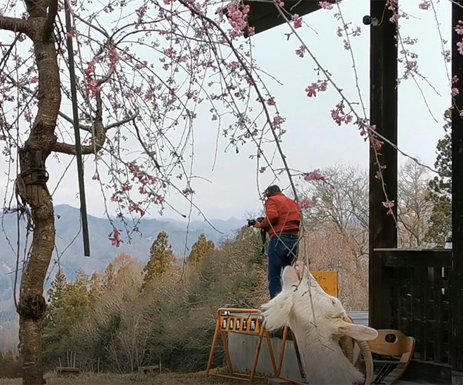 快晴で暖かい一日でした。 番所の桜、立屋の桜の開花も進みました。 番所の桜は5分咲き、立屋の桜は満開となりました。 子ヤギたちは、日中は放牧場へ、そして夕方小屋に帰ってくる生活をしています。