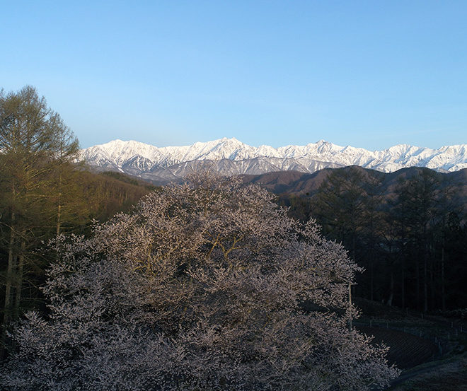 4月28日、6時現在気温マイナス4度。昨日の寒波みぞれから一転、今朝は晴れ渡っています。 立屋の桜は満開! その桜と後立山連峰を空撮してみました。