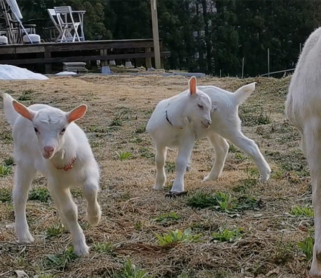 子ヤギたちは外で思いっきり遊んだ後は小屋でしゃがみこんで寝てしまいます。