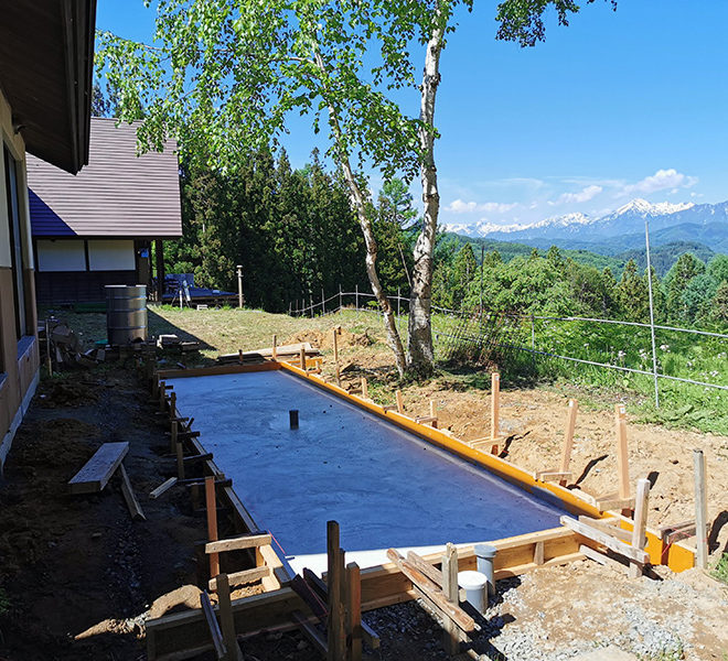 北アルプス展望露天風呂の建設を進めています。 まずは基礎工事。 バックホーで土を削り、砂利を入れて転圧。 型枠を作成して設置、メッシュと配管を設置して生コン入れです。