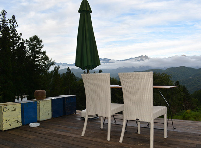 多くの方々に協力してもらい、ここまでできたテラスから北アルプスを眺めていると感無量です。