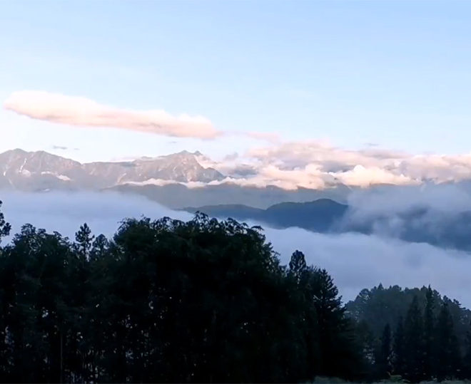 2020.9.12 昨日の夕立のおかげで今朝は雲海です。 そして、北アルプスを隠していた雲がカーテンのように過ぎ去って北アルプス劇場の開演です。 雲海もダンスしているようです。
